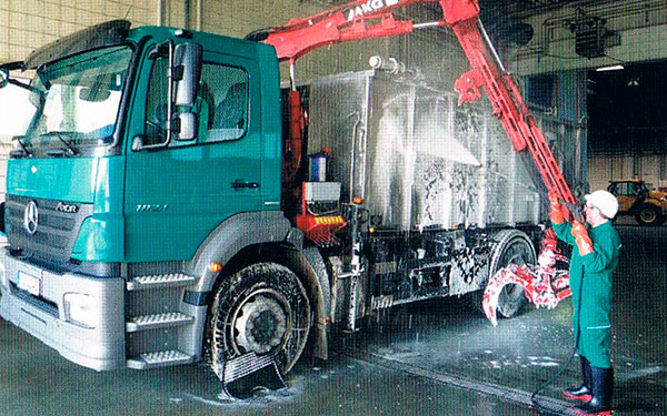Die Fahrzeuge verlassen die Rohwarenhalle durch die Fahrzeugwäsche, dort werden sie gereinigt und desinfiziert.